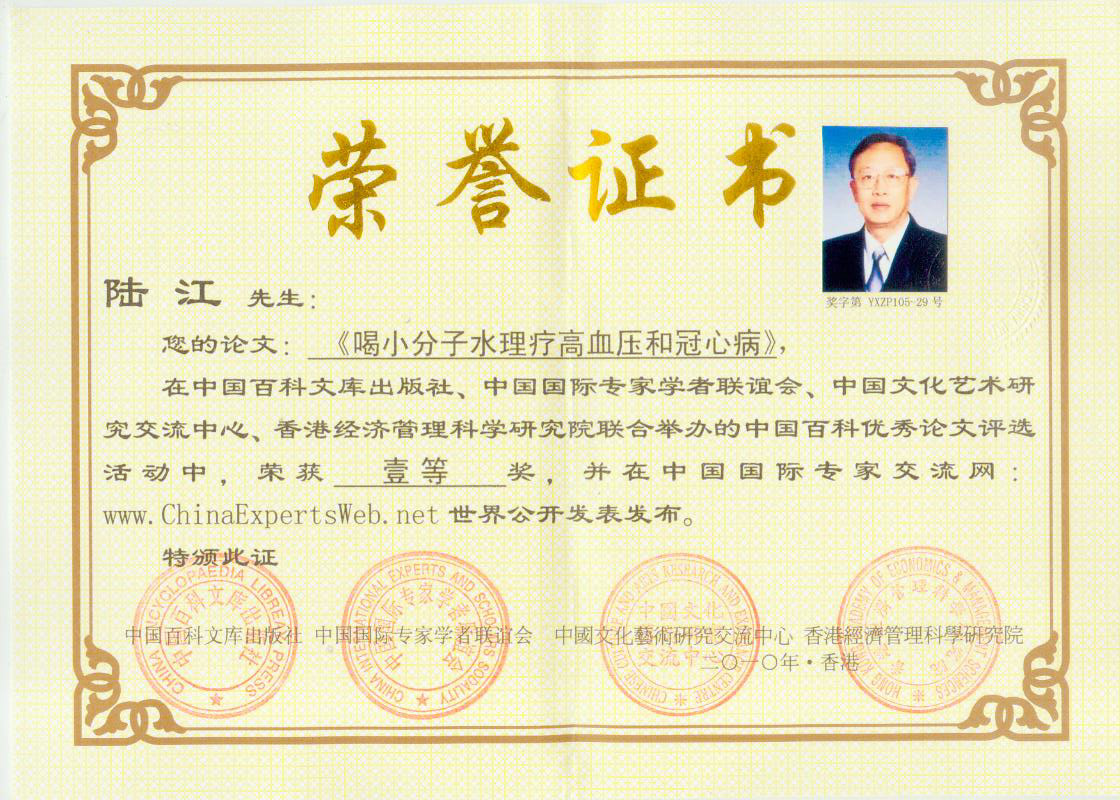 一.發明的亮點是中國基礎醫學研究成果的轉化醫學應用------------------------------------------------------------------------------------ 1990年春,我50歲,發現患了高血壓,便及時遵醫囑服藥。我想起父輩、祖輩曾患高血壓,后來都患中風癱瘓或心梗過世,所以心中壓力大。我夢想能根治高血壓,便研究醫學。當我檢索到中國基礎醫學研究成果,采用高脂餐和磁處理小分子團水飼喂小白鼠或大白免等兩組哺乳動物,經過2、4、6個月剖殺血檢,發現飼喂小分子團水的試驗組動脈內壁干凈,能減輕和延緩動脈粥樣硬化。我從這些研究成果受到啟發。覺得有責任研制出優良的器具,讓天下人能真正治愈高血壓,消除動脈粥樣硬化,延年益壽。于是,1990年我做成樣品,先后與愛人飲用兩三個月,分別治愈了高、低血壓,之后我們的血壓都正常,癥狀消失。該水經南京大學做核磁共振檢測為55.82赫茲的微小分子團水。該品經工業開發后,1994年送給廣西三家三甲醫院做臨床試用4個月,再經北京和廣西醫學專家鑒定認為:“降脂降壓效果好” ,“能擴大心腦動脈流量,改善心腦電圖和微循環” ,“對治療心腦動脈粥樣硬化、高血壓、高血脂有良好的醫療保健作用”。1996年產品獲得中國發明專利權。這就使產品可以轉化為醫學應用,人類可逐漸改變終生服藥,自己祛除病癥