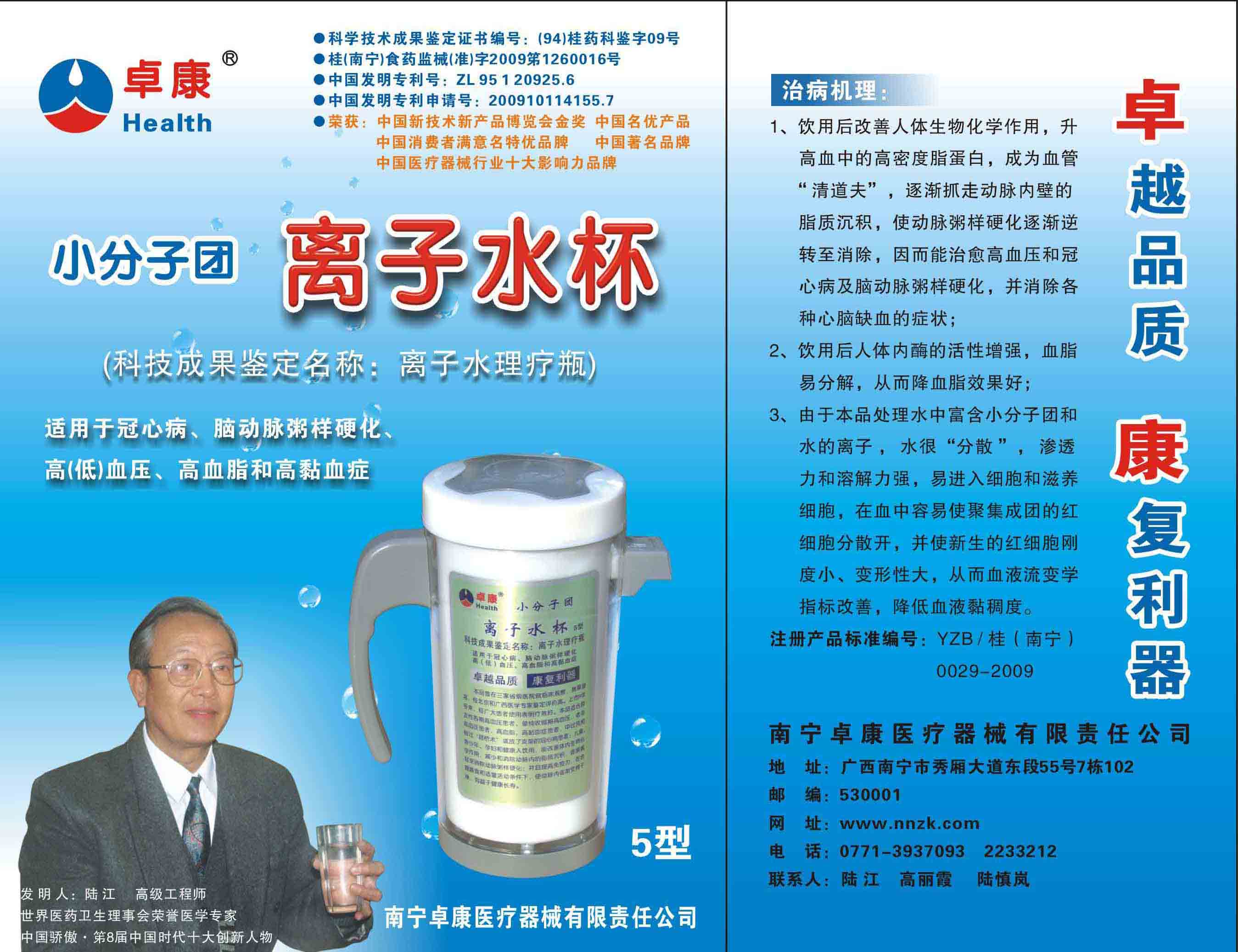本品大量用戶的使用效果表明,能治愈冠心病、腦動脈硬化、原發性高(低)血壓、高血脂、高粘血癥、高血尿酸癥(痛風)和2型糖尿病、衰弱器官并發癥(前列腺增生、腎衰與尿毒癥)及中風后遺癥等療效好。產品配信譽卡。使用壽命30年,不換芯,易清洗。團購優惠。從郵局匯款,匯費1%,地址按本頁下方地址、聯系人寫。從銀行匯款,請點擊[聯系匯款]欄,從工商銀行匯款,建設銀行、農業銀行匯款,均免收匯費,匯款后20--30分鐘內發短信,可用微信轉帳,均免匯費,微信號即手機號13768308380。匯款后,告知你的姓名和地址,我公司聯系人手機號是:13768308380卓康牌離子水瓶為我公司獨家生產,郵購產品配《補水的大智慧》彩印書一本,另配四季出版社出版的新書《補水的大智慧》一本,并配光盤一張(含央視主持人釆訪陸江的對話視頻)。目前市場和"淘寶網"上有人兜售假冒的偽品,望讀者審察辯別真偽,造假者剽竊假冒本公司的各種證、獲獎獎項、專利號和外包裝盒上的中英文字,包括科技成果的鑒定意見等,請讀者注意防偽。如何識別假貨?已經買了假貨怎么辦?(請點擊[打假掠影][打假掠影])。